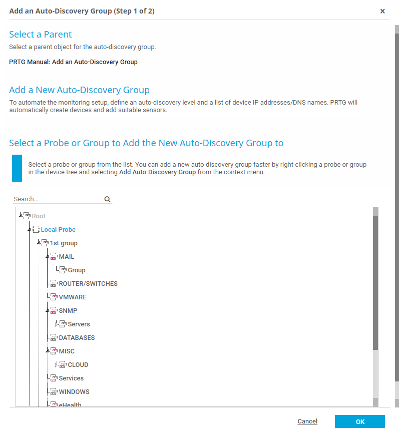 Select the probe or group that you want to add the new auto-discovery group to. Click OK.