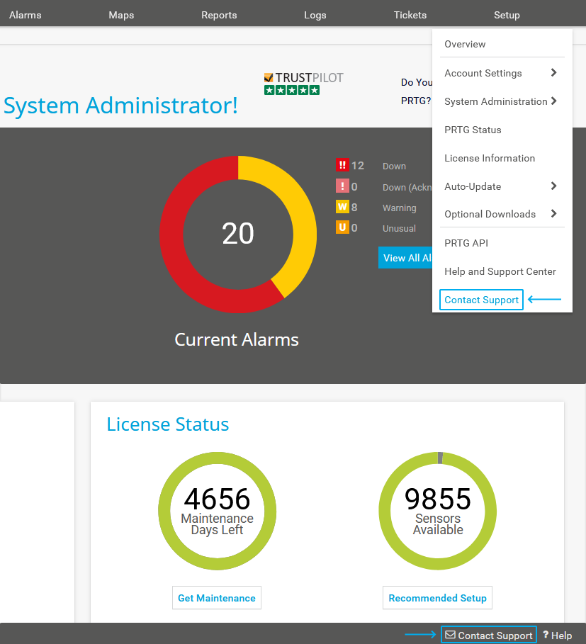 The Contact Support feature is only available for users with an active subscription of PRTG Network Monitor, PRTG Enterprise Monitor, or PRTG Hosted Monitor or if you have valid maintenance. This feature is not available for freeware edition licenses.