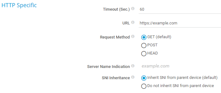 The Server Name Indication (SNI) that the sensor automatically determines from the host address of the parent device or from the target URL of the sensor. The SNI must be a fully qualified domain name (FQDN). Make sure that it matches the configuration of the target server.