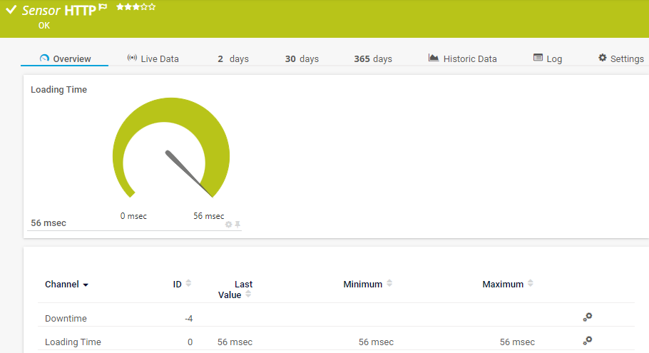 In the channel table on the Overview tab, this channel never shows any values. PRTG uses this channel in graphs and reports to show the amount of time in which the sensor was in the Down status