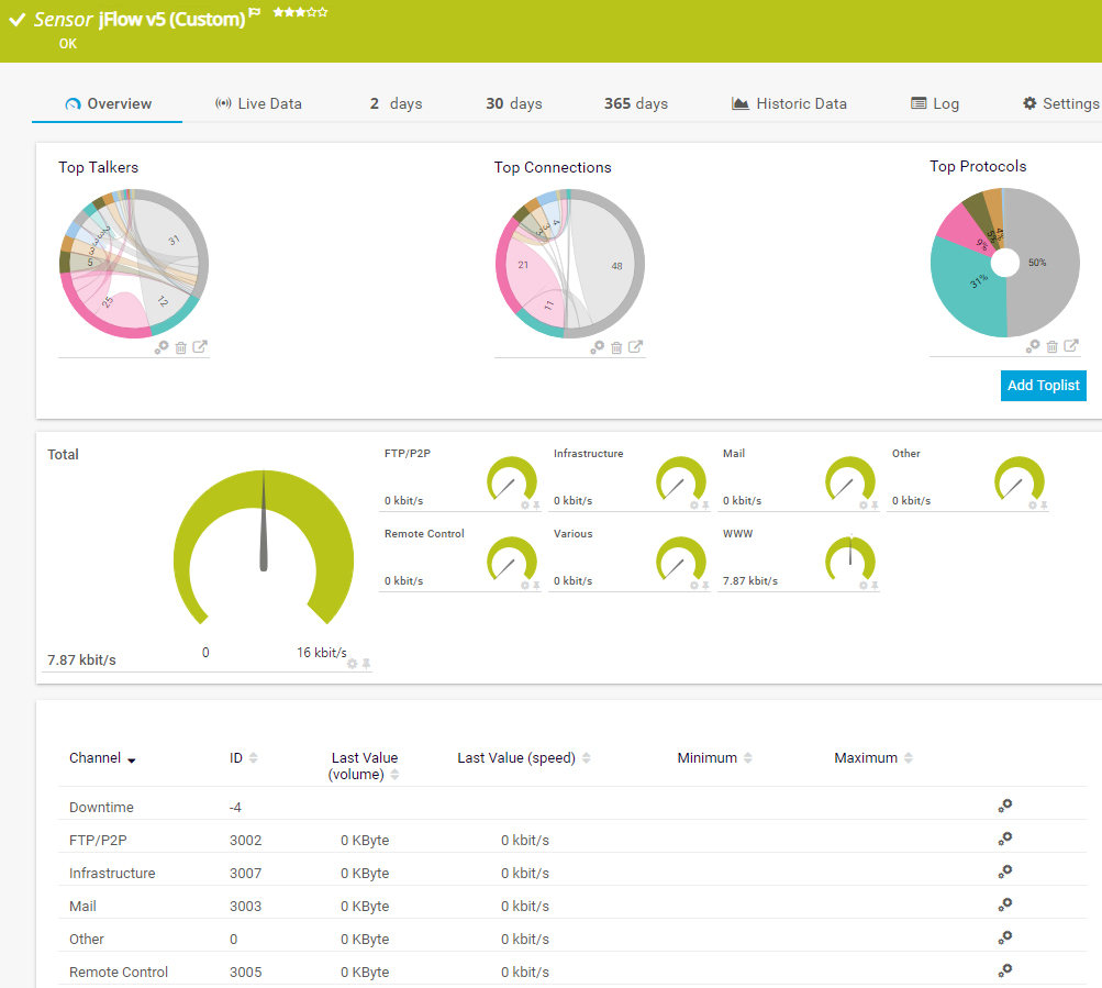 For all Flow (NetFlow, jFlow, sFlow, IPFIX) and Packet Sniffer sensors, Toplists are available on the sensor's Overview tab. Using Toplists, you can review traffic data for small time periods in great detail.