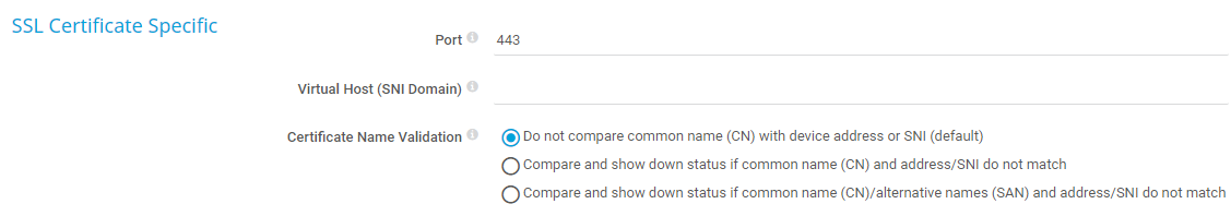Compare and show down status if common name (CN)/alternative names (SAN) and address/SNI do not match: Check the common name and the Subject Alternative Names (SAN) to validate the certificate. If you define an SNI domain above, the sensor compares the common name and alternative names with the SNI. If you do not define an SNI, the sensor uses the host address of the parent device. If the common name or alternative names and the checked address/SNI do not match, the sensor shows the Down status.