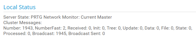 If you run PRTG in a cluster, this shows information for the system of the cluster node you are logged in to. You must log in to the primary master node to see synchronization data for remote probe connections.